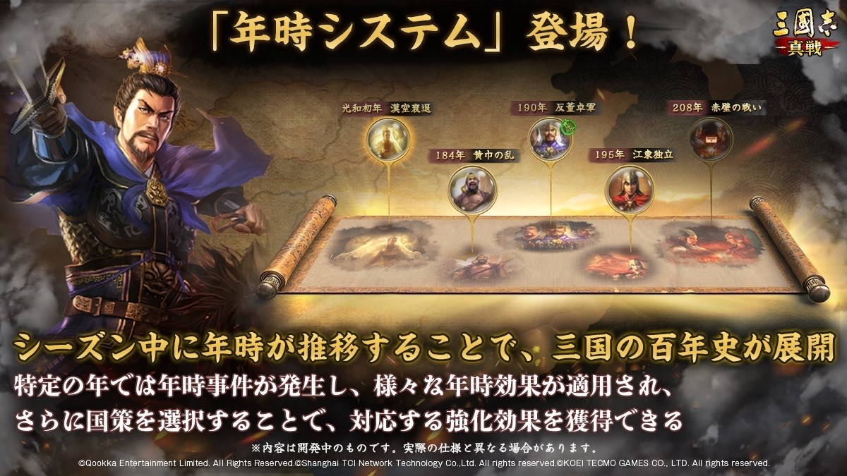 新システム【年時システム】登場。年時が推移することで、三国の百年史が展開する。ゲーム内時間はリアルの1日がシーズン中の1年となって進み、毎日5時に新しい年になる。特定の年では年時事件が発生し、様々な年時効果が適用される。また国策を選択することで、対応する強化効果を獲得できる。