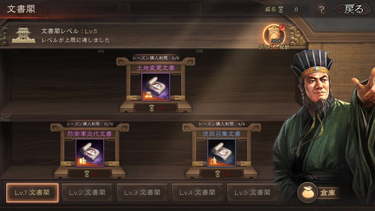 威名を使用して強力な文書と交換し、資源獲得を加速させ、屈強な軍勢を作ろう。プレイヤーは威名を使用し、開放済みの文書閣で文書を交換できる。威名は毎日受け取ることができ、また活躍によっても獲得できる。文書閣は5つのレベルがあり、年が進むとレベル上限も開放される。文書閣がレベルアップするとともに、交換できる文書も増える。