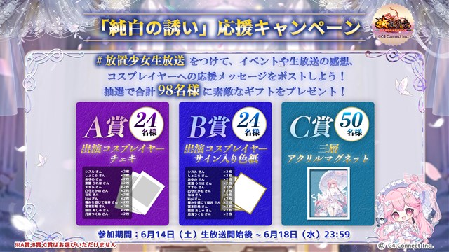 Xにて「純白の誘い」応援キャンペーンを実施!6月14日の生放送開始後〜6月18日23:59まで、「#放置少女生放送」をつけて、イベントや生放送の感想、コスプレイヤーへの応援メッセージなどをポストしてくれた方の中から抽選で合計98名に素敵なギフトをプレゼント!