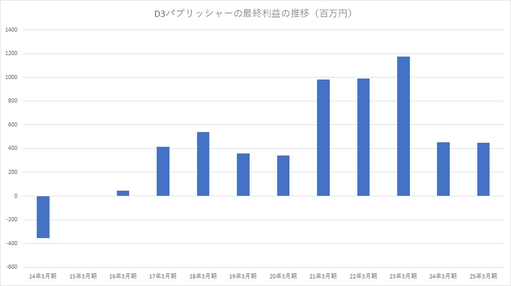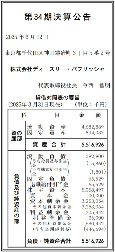 ディースリー・パブリッシャーの2025年3月期(第34期)の決算は、最終利益が前の期比0.9%減の4億4600万円と横ばいだった。前の期(2024年3月期)の実績は、最終利益4億5100万円だった。6月13日付の『官報』に掲載された「決算公告」で判明した。