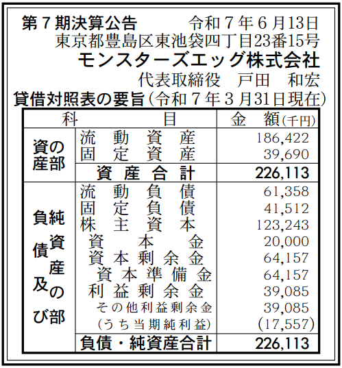 モンスターズエッグの2025年3月期(第7期)の決算は、最終利益が前の期比94.4%増の1700万円と大幅増益を達成した。前の期(2024年3月期)の実績は、最終利益900万円だった。6月13日付の『官報』に掲載された「決算公告」で判明した。