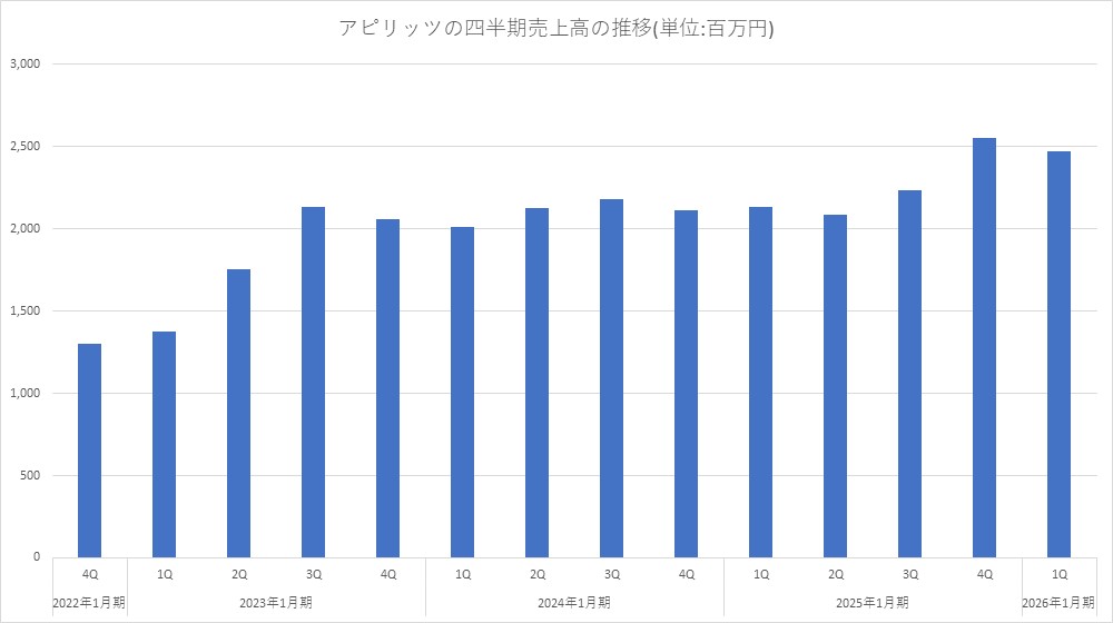 アピリッツ<4174>は、6月13日、2026年1月期 第1四半期の連結決算を発表し、売上高24億7500万円(前年同期比6.2%増)、営業利益200万円(同97.9%減)、経常損失000万円(前年同期は1億2300万円の利益計上)、最終損失900万円(同7600万円の利益計上)だった。