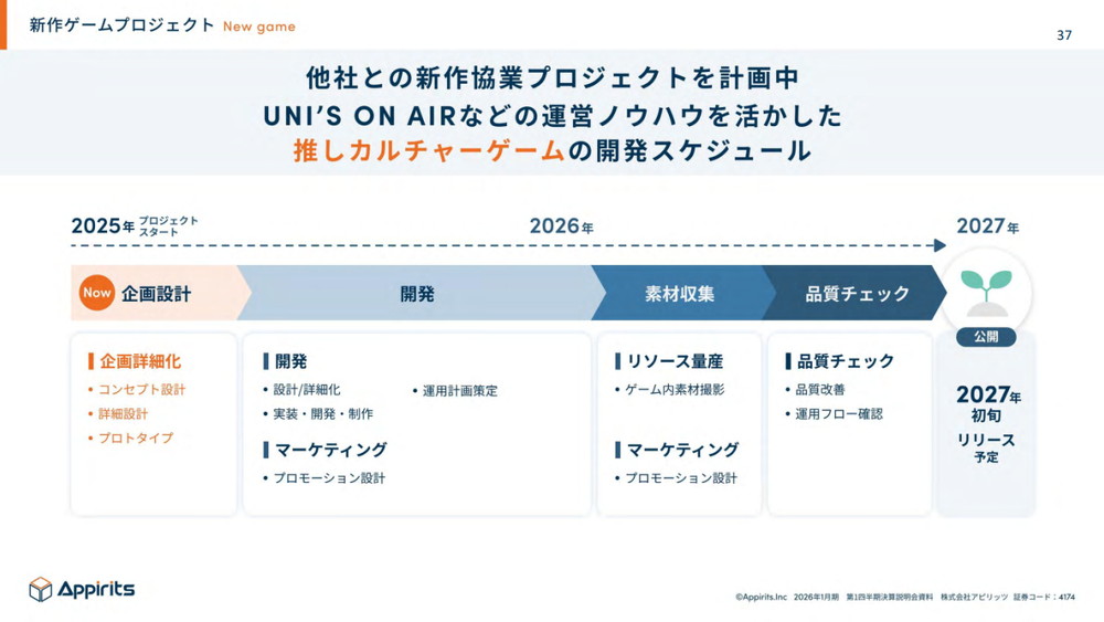 アピリッツ<4174>は、この日(6月13日)に開示したい第1四半期の決算説明資料において、新たに「推しカルチャーゲーム」を開発することを明らかにした。推しカルチャーゲームとはどんな内容なのか気になるところだが、他社との協業プロジェクトで、コンセプト設計やプロトタイプ開発などを行う企画設計の段階にあるとのこと。企画設計が完了後、本開発に移行し、素材収集、品質チェックなどを経て、2027年初頭にリリースする予定だ。
