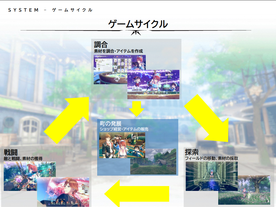 「調合」で作ったアイテムを自分のショップで販売して町を発展させたい!さまざまなアイテムを販売することでお金を稼ぎ、稼いだお金を出資することで町が発展していく。町が発展することで、新たな調合レシピを獲得したり、メインストーリーが進行する。