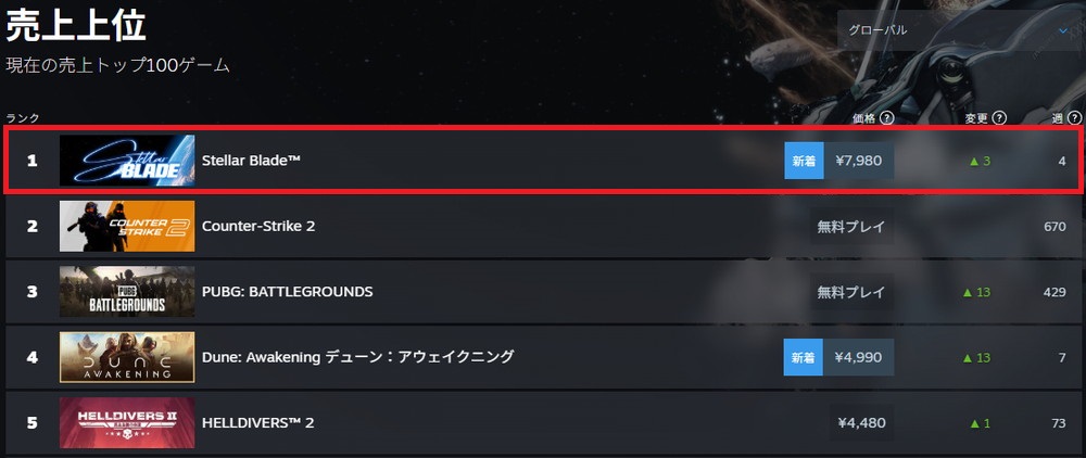 | 1 | 1 | → | Stellar Blade™ | ¥7,980 | PlayStation Publishing (excluding China) | 6/12発売 |