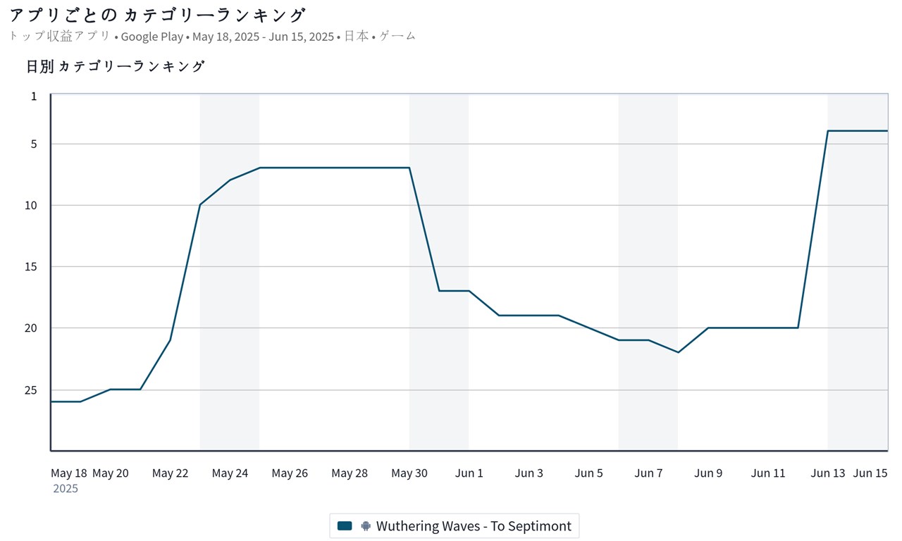 トップ10圏内では、KURO GAMESの『鳴潮(メイチョウ)』が4位に浮上してきた。『鳴潮』は、6月12日にVer2.4「栄冠を飾る勝鬨」を実装しており、星5共鳴者「カルテジア」がピックアップ対象となった共鳴者集音(イベント)「風と潮を越え、たおやかに舞う」を開催していることが売上がつながっているようだ。