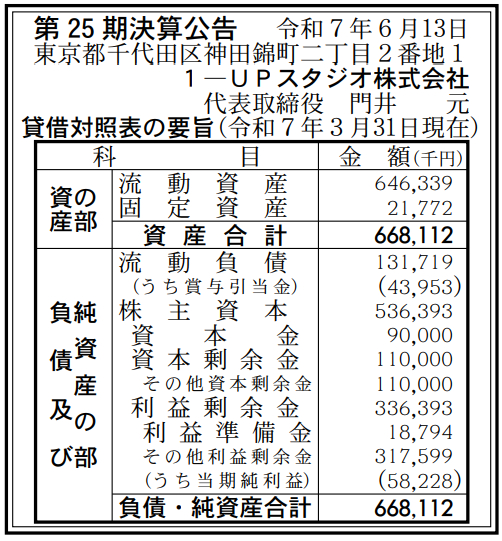 1-UPスタジオの2025年3月期(第25期)の決算は、最終利益が前の期比5.8%増の5800万円と増益を達成した。前の期(2024年3月期)の実績は、最終利益5500万円だった。6月16日付の『官報』に掲載された「決算公告」で判明した。