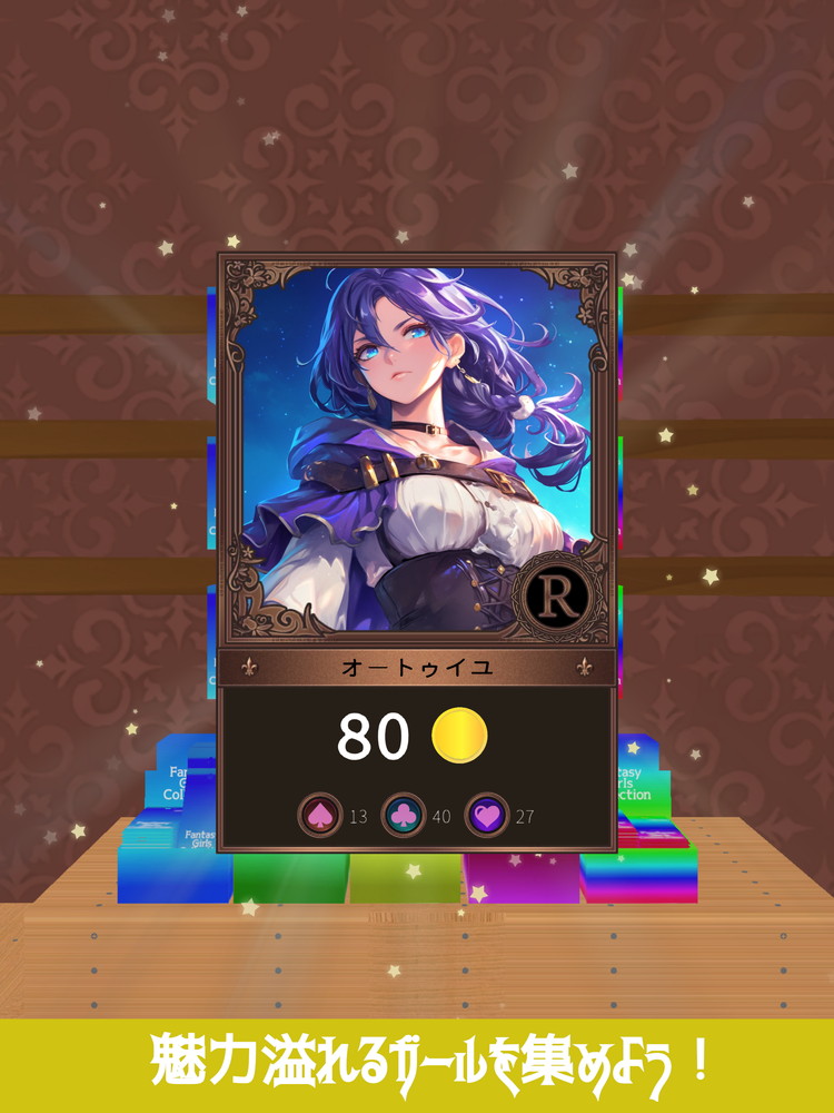 カードは全てファンタジー世界の女の子たちで、手に入れたカードに応じてさらに新しいパックを開けるアイテムが手に入る。