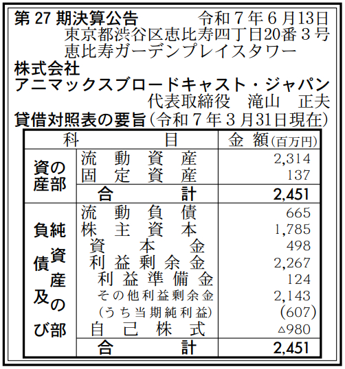 アニマックスブロードキャスト・ジャパンの2025年3月期(第27期)の決算は、最終利益が前の期比9.3%増の6億0700万円と増益を達成した。前の期(2024年3月期)の実績は、最終利益5億5500万円だった。6月16日付の『官報』に掲載された「決算公告」で判明した。