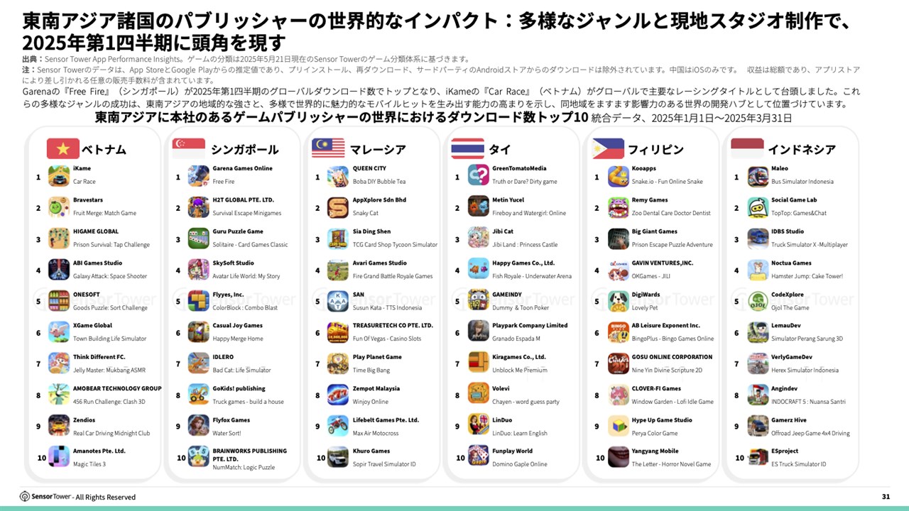 東南アジア、特にシンガポールとベトナムに本社のあるパブリッシャーは世界的に大きなインパクトを示しており、ダウンロード数で上位に入り、東南アジアを主要な開発ハブとして確立させている。2025年第1四半期のハイライトとしては、Garenaの『Garena Free Fire』(シンガポール)が世界のダウンロード数で上位に入り、iKameの『Car Race』(ベトナム)が世界的に大きな人気を集めていることが挙げられる。特に、トレンドのゲームプレイを活用し、口コミでも話題を集めたサバイバルをテーマとしたヒットにより、2025年第1四半期にベトナムのパブリッシャーが世界のダウンロード数成長量で上位に入った。