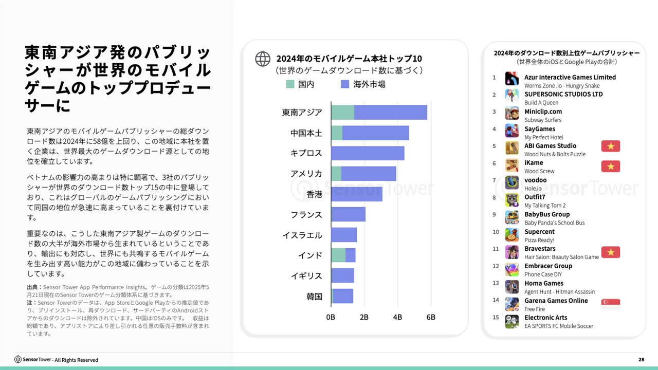 東南アジアを本拠とするパブリッシャーは、世界的な存在感を強めている。2024年に、東南アジアを本拠とするパブリッシャーは全体でモバイルゲームのダウンロード数で世界1位にランクインし、58億のインストールを生み出した。特に、ベトナムの3社のパブリッシャーが世界のダウンロード数トップ15内に登場し、ゲームパブリッシングにおける同国の影響力の高まりを示した。これらのダウンロード数のほとんどは海外市場から生まれており、世界にアピールするモバイルゲームを生み出すこの地域の能力を示している。