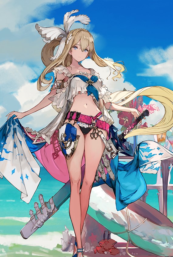 魔具「水神の鎧布」を身にまとったクロエ。黒いビキニと帽子は元気っ子の証。夏の日差しに健康的な肌が映える!