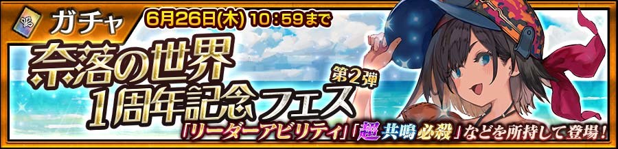 奈落の世界のリリース1周年を記念して、特別衣装の「セラ」が登場する「奈落の世界1周年記念フェス」第1弾を開催する。このフェスで登場する「白き天女 セラ」は第5部以降に登場する一部のキャラクターが持つ「リーダーアビリティ」に加えて、「超共鳴必殺」も持っている。