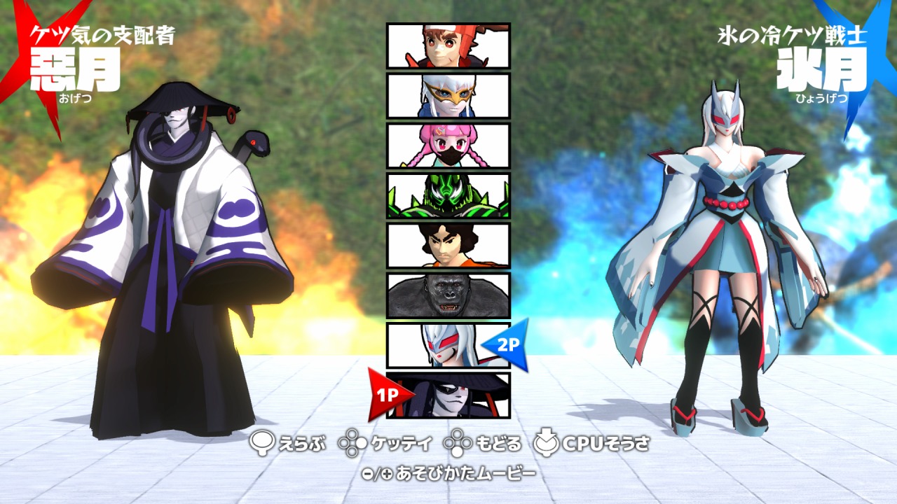 「決気の支配者」の惡月は、ケツから力を集中させる「決気(けつき)」を操り、ケツ奥義「蛇頭竜尾(ケツヴェノム)」で自動追尾の「一撃ケッ着(決着)」を狙いる。一方、氷月は「氷の冷ケツ戦士」として、華麗な刀さばきと「冷ケツ(冷血)」な高速移動で相手を翻弄。ケツ奥義「零血」は、相手を凍らせ動きを封じる。