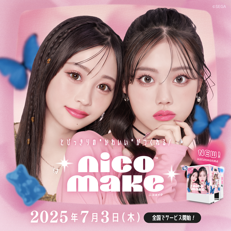 セガグループのセガ フェイブは、最新プリクラ機『NICO MAKE(ニコメイク)』(以下、NICO MAKE)を2025年7月3日(木)より全国のゲームセンターでサービス開始する。