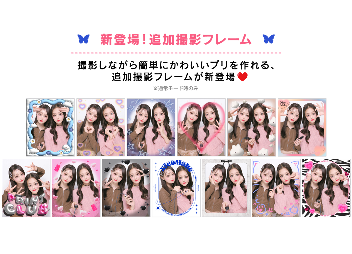 『NICO MAKE』では、追加撮影中にリアルタイムで反映される追加撮影フレームを新実装! 撮影中にフレームをプレビューすることでより直感的に「盛れた」プリ画像が撮れる機能にバージョンアップした。