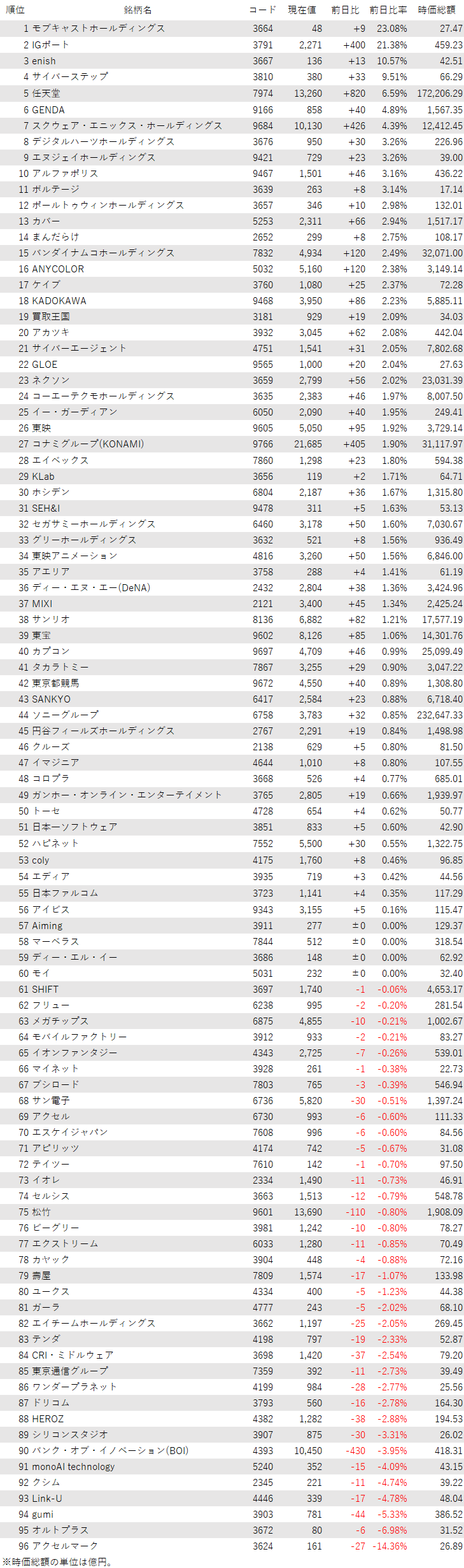 こうしたなか、ゲーム・エンタメ関連企業をみると、登録されている96銘柄のうち、上昇は56銘柄(58%)、下落は36銘柄(38%)、変わらずは4銘柄(4%)で、上昇した銘柄のほうが多かった。