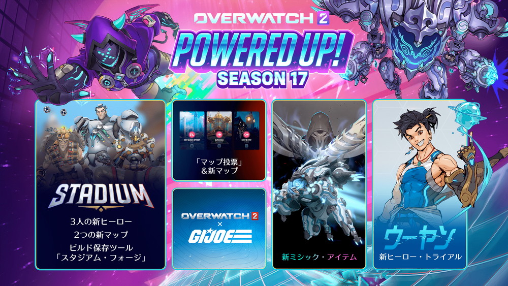 Activision Blizzard Japanは、『オーバーウォッチ 2』でシーズン17「パワー・アップ!」を日本時間6月25日より開幕する。シーズン17では、新マップや新ヒーローの追加、ビルド保存システムの実装、「マップ投票」システムなど、ゲームプレイをさらに楽しくする新要素が「スタジアム」に多数登場する。さらに、新シーズンの開始を記念して、2種類のミシック・アイテムや、必ずレジェンダリー・アイテムが手に入るイベントなど、魅力的なコンテンツが盛りだくさん。