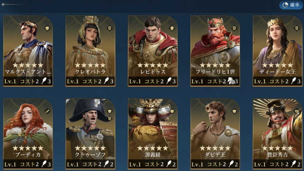 クレオパトラ、カエサル、織田信長、宮本武蔵、ジャンヌ・ダルク、孫武、始皇帝、ムーラン、ヴィクトリア女王、ギルガメシュ、アレクサンドロス大王など、古今東西の歴史的英傑が100人以上登場する。プレイヤーはこれらの英傑たちを選択し、独自の部隊を結成することができる。