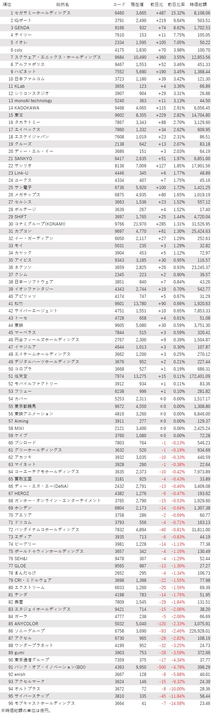 そうした中でゲーム・エンタメ関連株の動きを見てみると、下記の表に登録しているゲーム・エンタメ関連企業96銘柄のうち、上昇は53銘柄(55%)、下落は37銘柄(39%)、変わらずは6銘柄(6%)で、上昇した銘柄のほうが多かった。