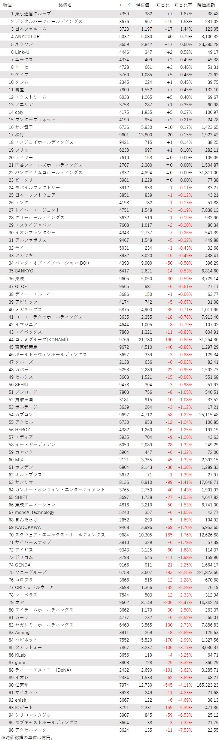 そうした中でゲーム・エンタメ関連株の動きを見てみると、下記の表に登録しているゲーム・エンタメ関連企業96銘柄のうち、上昇は19銘柄(20%)、下落は73銘柄(76%)、変わらずは4銘柄(4%)で、下落した銘柄が多数を占めた。