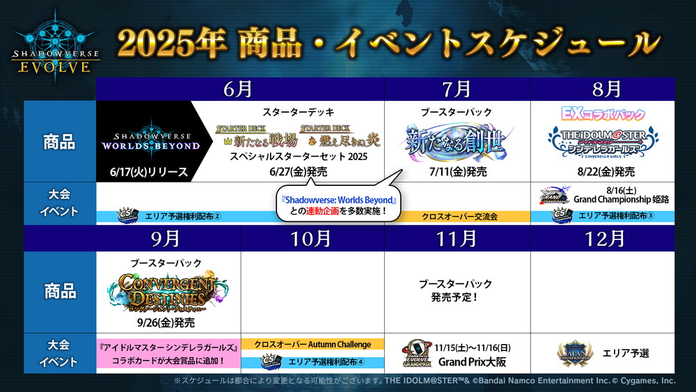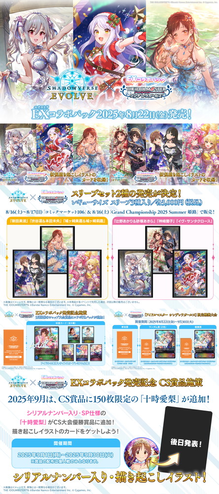 EXコラボパック「アイドルマスター シンデレラガールズ」は8月22日に発売。コミックマーケット106やGrand Championship 2025 Summer 姫路では、新規描き起こしイラストのスリーブセットが発売される。さらに、ショップ大会でのコラボPRパック追加や限定構築大会の開催、Shadowverse EVOLVE Championshipの優勝賞品に限定カード「十時愛梨」が追加されるなど、イベントも盛りだくさん。