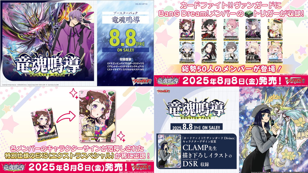 ブースターパック「竜魂鳴導」は8月8日に発売され、バンドリ!10バンド50人のメンバーやCLAMP先生描き下ろしイラストが収録される。そして10月10日にはブースターパック「武奏烈華」が発売され、アニメ「デラックス決勝編」登場ユニットや新たなヴェルリーナが登場する。