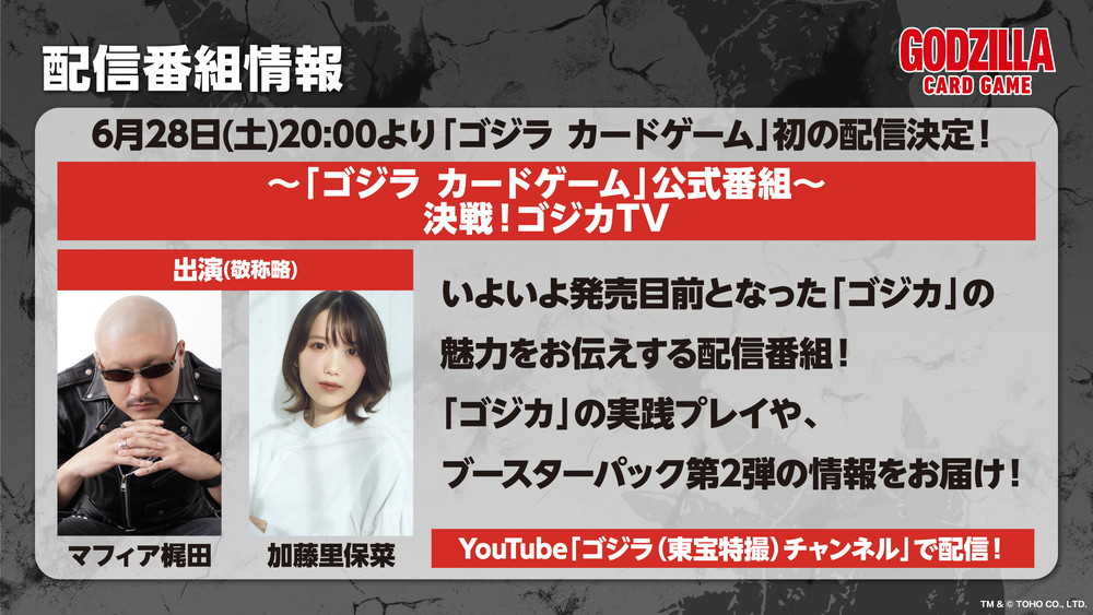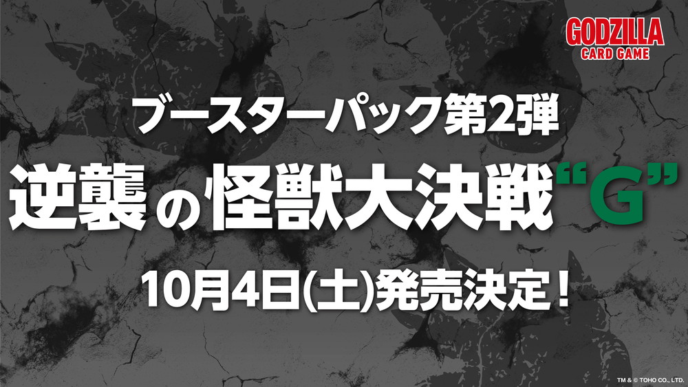 ブースターパック第2弾「逆襲の怪獣大決戦"G"」が10月4日に発売決定。「ちびゴジラの逆襲」や出演キャストのサインカードが収録される。発売直前の6月28日20:00からは、公式生配信番組「決戦!ゴジカTV」が配信され、実践プレイやブースターパック第2弾の追加情報が公開される。
