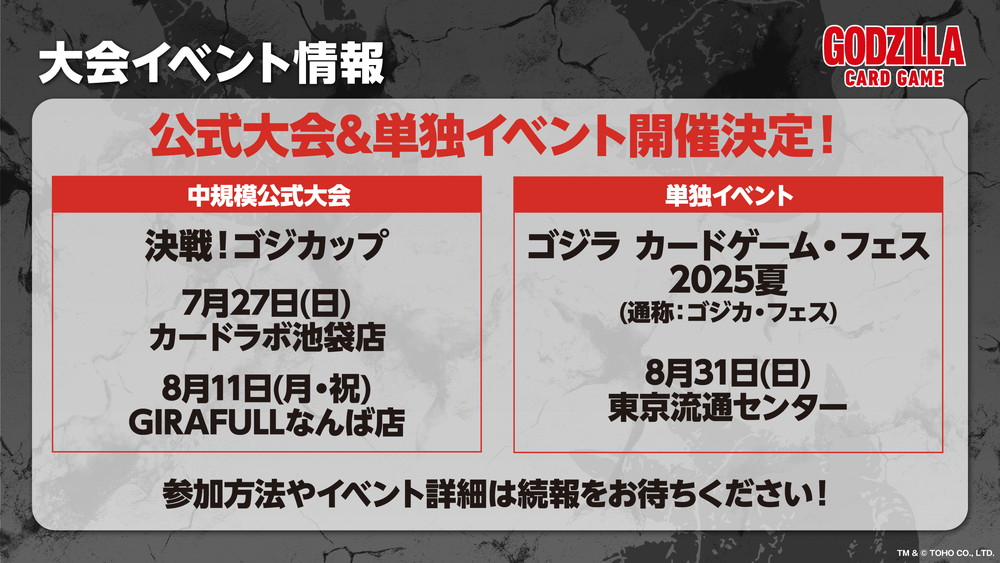 公式イベントも開催され、中規模公式大会「決戦!ゴジカップ」が7月27日に東京、8月11日に大阪で開催。初の単独イベント「ゴジラ カードゲーム・フェス 2025夏」は8月31日に東京流通センターで開催される。