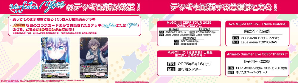 さらに、7月12日からはバンドリ!のイベントで「Morfonica」「MyGO!!!!!」の構築済みデッキが配布決定。