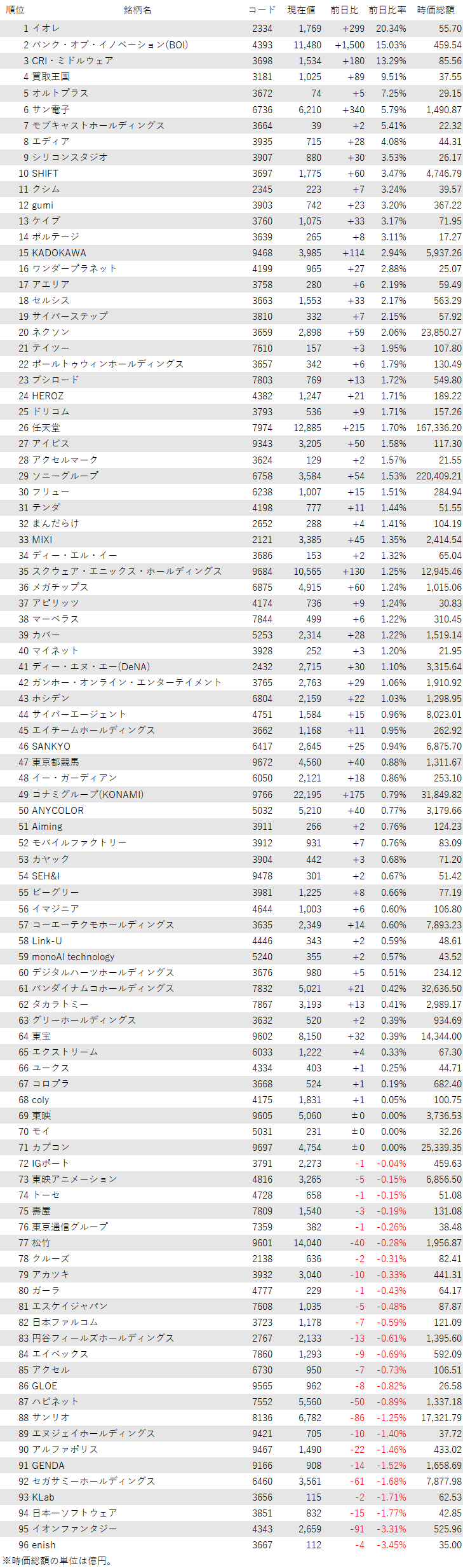 イオレ<2334>や、CRI・ミドルウェア<3698>、買取王国<3181>、オルトプラス<3672>も大幅高となった。東証プライムの主力株は上がったものの、新たな手がかり材料に乏しく、グロースやスタンダードの値動きの軽い中小型株に物色の矛先が向かったようだ。