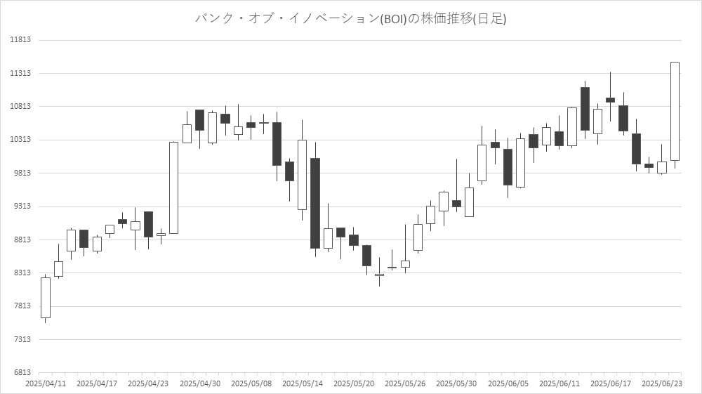 個別銘柄では、バンク・オブ・イノベーション(BOI)<4393>がストップ高まで買われた。有力個人投資家がSNSで購入したことを示唆したことを受けて、短期資金が入ったもようだ。