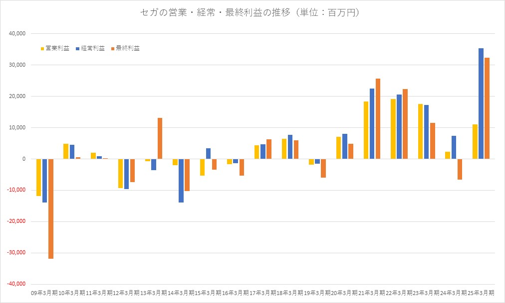 セガの2025年3月期(第67期)の決算は、営業利益が前の期比373.7%増の111億円、経常利益が同374.3%増の352億円と大幅増益を達成した。最終利益も323億円と前の期66億円の赤字から黒字転換した。経常利益と最終利益は直近で最高水準となった。