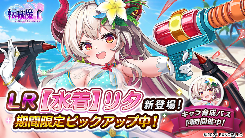 魔王の幼馴染である「リタ」が水着姿で期間限定登場。現在開催中の『期間限定ピックアップガチャ』では、「【LR】水着リタ」の排出確率がアップしている。また、【LR】キャラクターが1体確定する『【LR】キャラ確定ガチャ』も同時開催されており、このガチャでは1/3の確率で「【LR】水着リタ」が登場。