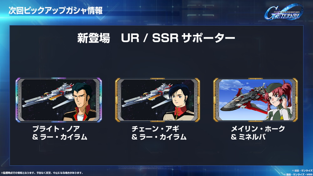 6月30日から開催予定のピックアップガシャには期間限定ユニットとしてUR「Hi-νガンダム(EX)」/UR「アムロ・レイ」、期間限定サポーターとしてUR「ブライト・ノア&ラー・カイラム」が登場予定。また、UR「フォースインパルスガンダム(EX)」/UR「シン・アスカ」のほか、SSRユニット、サポーターも多数追加予定。
