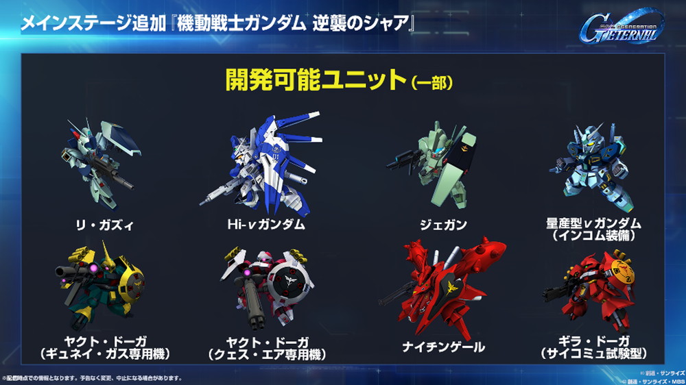 メインステージの追加に伴い、「機動戦士ガンダムSEED DESTINY」、「機動戦士ガンダム 逆襲のシャア」にちなんだ機体がゲーム内で登場する。メインステージをプレイして、ユニットの開発を進め、強力なユニットを獲得しよう。