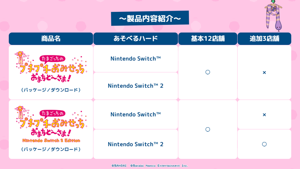 2005年に第1作目が発売された「たまごっちのプチプチおみせっち」シリーズの最新作Nintendo Switch向けソフト「たまごっちのプチプチおみせっち おまちど~さま!」と、Nintendo Switch 2 向けソフト「たまごっちのプチプチおみせっち おまちど~さま! Nintendo Switch 2 Edtition」がそれぞれパッケージ版・ダウンロード版ともに本日発売。