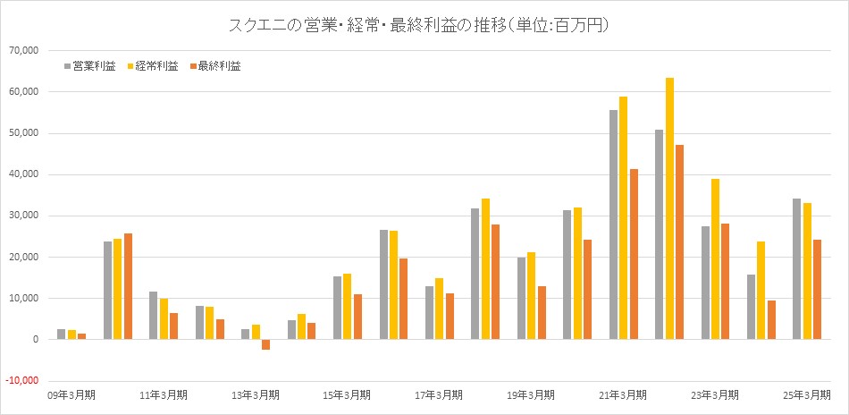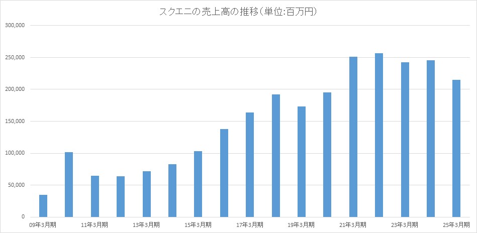 スクウェア・エニックスの2025年3月期(第17期)の決算は、売上高2146億3400万円(前の期比12.5%減)、営業利益342億8000万円(同117.5%増)、経常利益332億1800万円(同39.7%増)、最終利益242億0500万円(同152.2%増)だった。