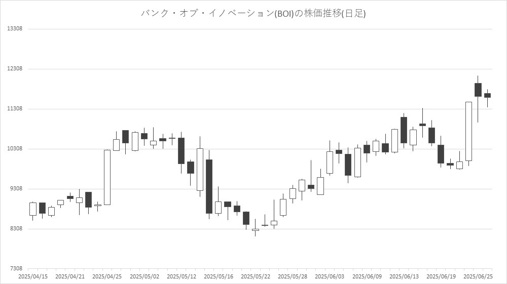 バンク・オブ・イノベーション(BOI)<4393>は反落。著名な個人投資家が同社株を購入したことをSNS上示唆したことで追随買いが入り連日の年初来高値更新となったが、この日は利益確定の売りに押された模様だ。