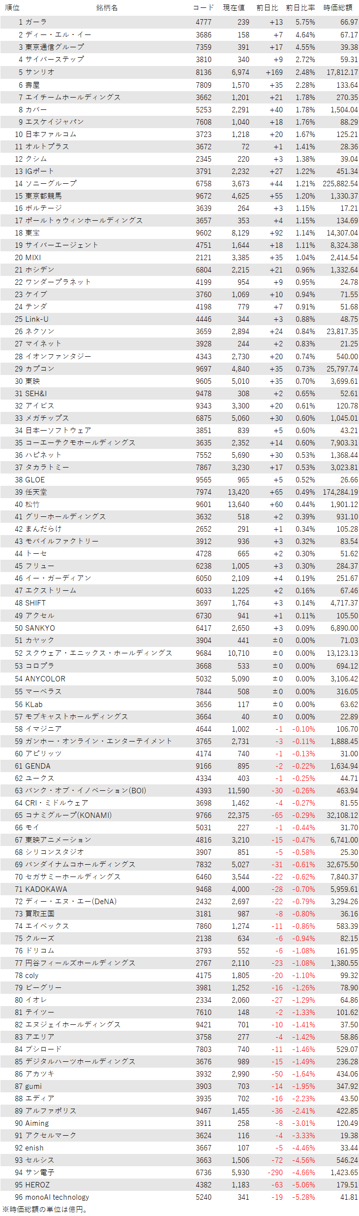 こうしたなか、ゲーム・エンタメ関連企業をみると、登録されている96銘柄のうち、上昇は50銘柄(52%)、下落は39銘柄(41%)、変わらずは7銘柄(7%)で、上昇した銘柄のほうが多かった。