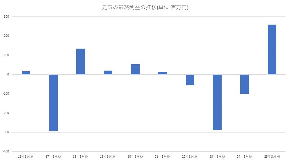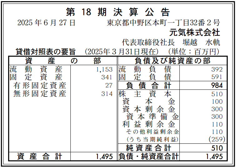 元気の2025年3月期(第18期)の決算は、最終利益が2億5900万円と黒字転換を達成した。前の期(2024年3月期)の実績は、最終損失1億円だった。6月27日付の『官報』に掲載された「決算公告」で判明した。