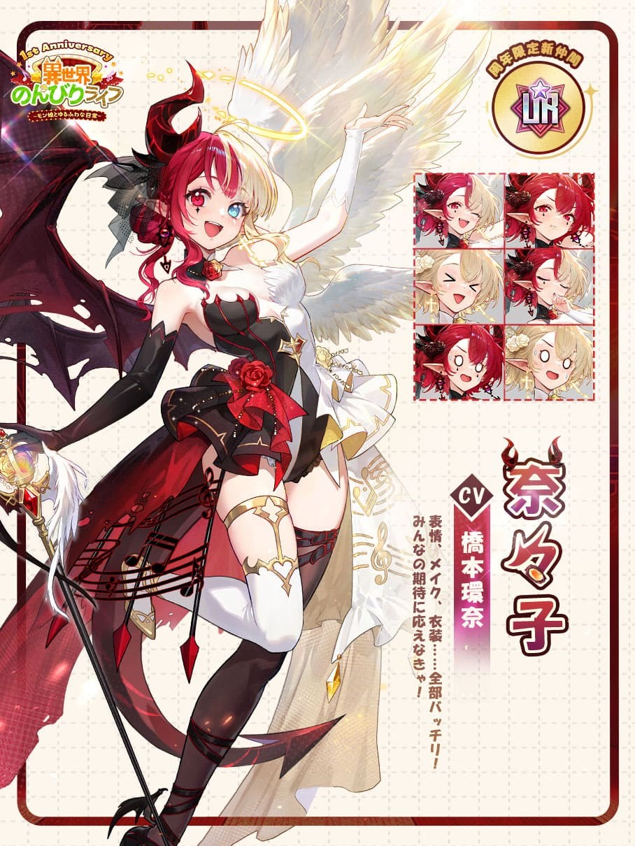 新UR☆仲間、異世界初のミュージカル女優「奈々子」が華麗に登場する。時に妖しく悪魔のように、時に清らかで天使のように--その変幻自在な演技と魅力で、すべての観客を魅了する。新感覚のミニゲームも同時登場。天使と悪魔、ふたつの個性がぶつかり合う消しごたえを楽しみながら、イベントミッションをクリアして豪華報酬を手に入れよう!