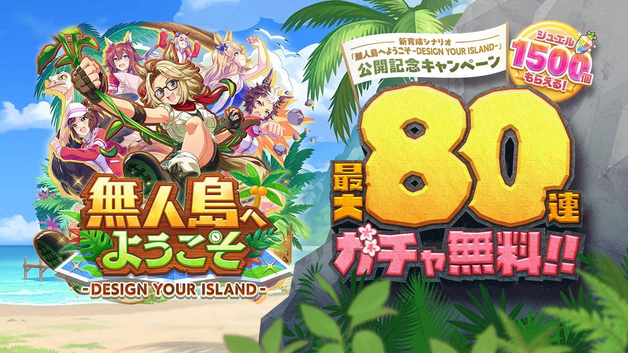 新育成シナリオ「無人島へようこそ -DESIGN YOUR ISLAND-」の公開を記念して、本日からゲーム内でさまざまなキャンペーンを実施する。「1日1回10連ガチャ無料キャンペーン」では、期間中に毎日ログインすると、開催中のガチャの「10回引く!」を最大8回まで1日1回無料で引くことができる。