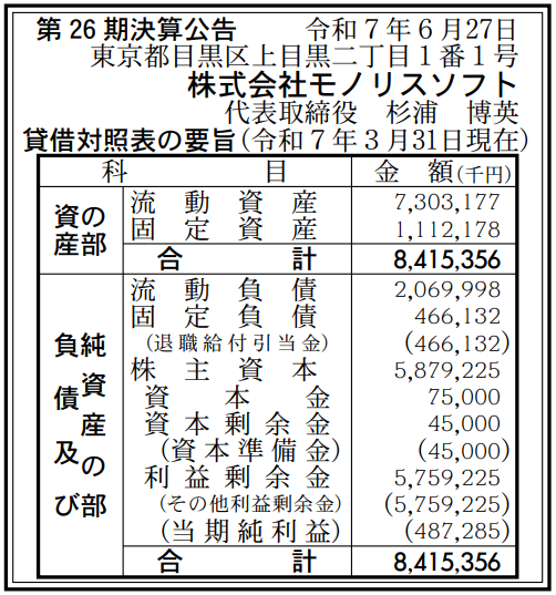モノリスソフトの2025年3月期(第26期)の決算は、最終利益が前の期比19.0%増の4億8700万円と増益を達成した。前の期(2024年3月期)の実績は、最終利益4億0900万円だった。6月27日付の『官報』に掲載された「決算公告」で判明した。