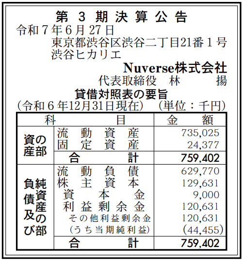Nuverseの2024年12月期(第3期)の決算は、最終利益が前の期比5%減の4400万円と減益だった。前の期(2023年12月期)の実績は、最終利益4600万円だった。6月27日付の『官報』に掲載された「決算公告」で判明した。
