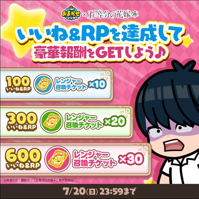 コラボを記念して『LINE おまかせレンジャー』の公式X(旧Twitter)アカウント(https://x.com/LINE_OMAREN_JP)をフォローしてキャンペーンポストをみんなでいいね& リポストして目標達成すると、 レンジャー召喚チケットがもらえる。