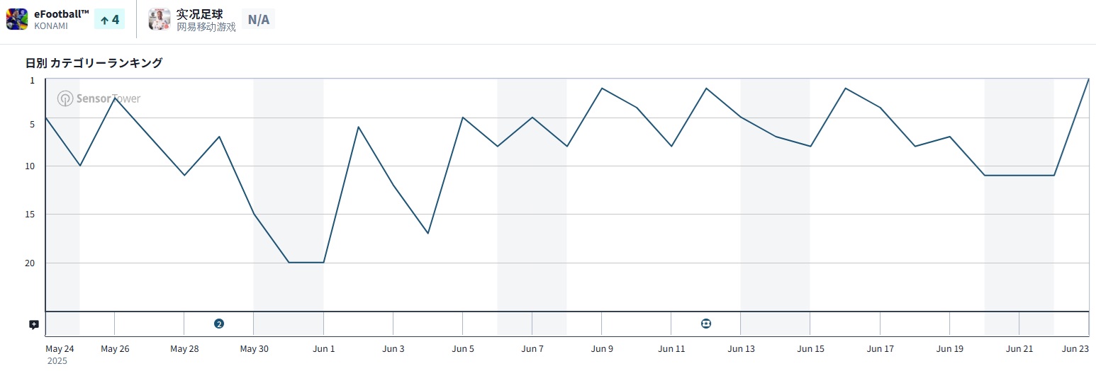 6月25日9時30分現在のApp Storeセールスランキング(ゲームカテゴリー)は、コナミデジタルエンタテインメントの『eFootball』が首位をキープしている。