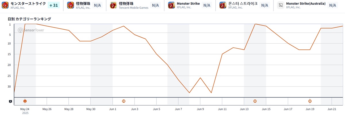 | 2 | 13 | ↑11 | モンスターストライク | MIXI<2121> |