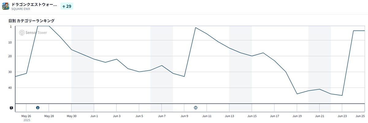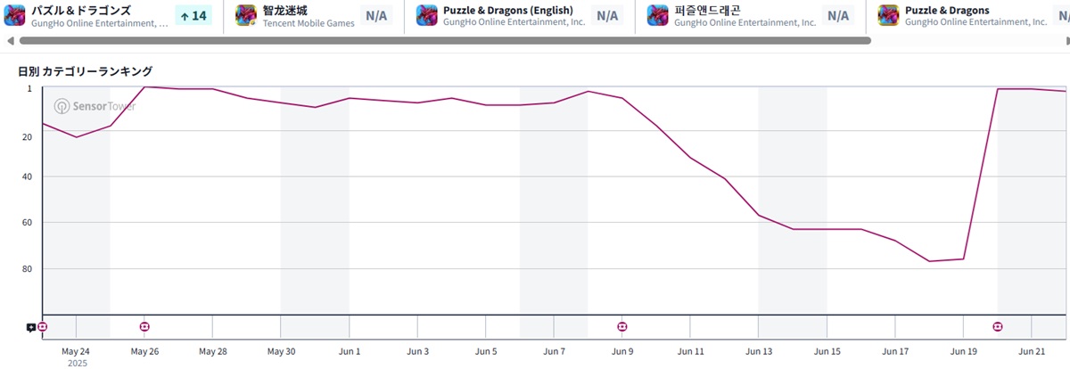 『パズドラ』は6/20から「歴世の杯と神創の雫ガチャ」と、今回より新たに登場するモンスターがラインナップされる「歴世の杯と神創の雫ガチャ2」が登場しており、売上につながったようだ。