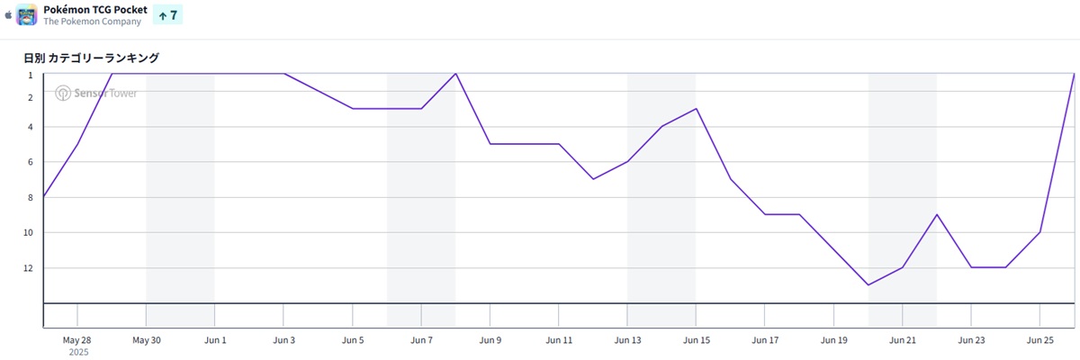 | 1 | 10 | ↑9 | Pokémon TCG Pocket | ポケモン/DeNA<2432>/クリーチャーズ |